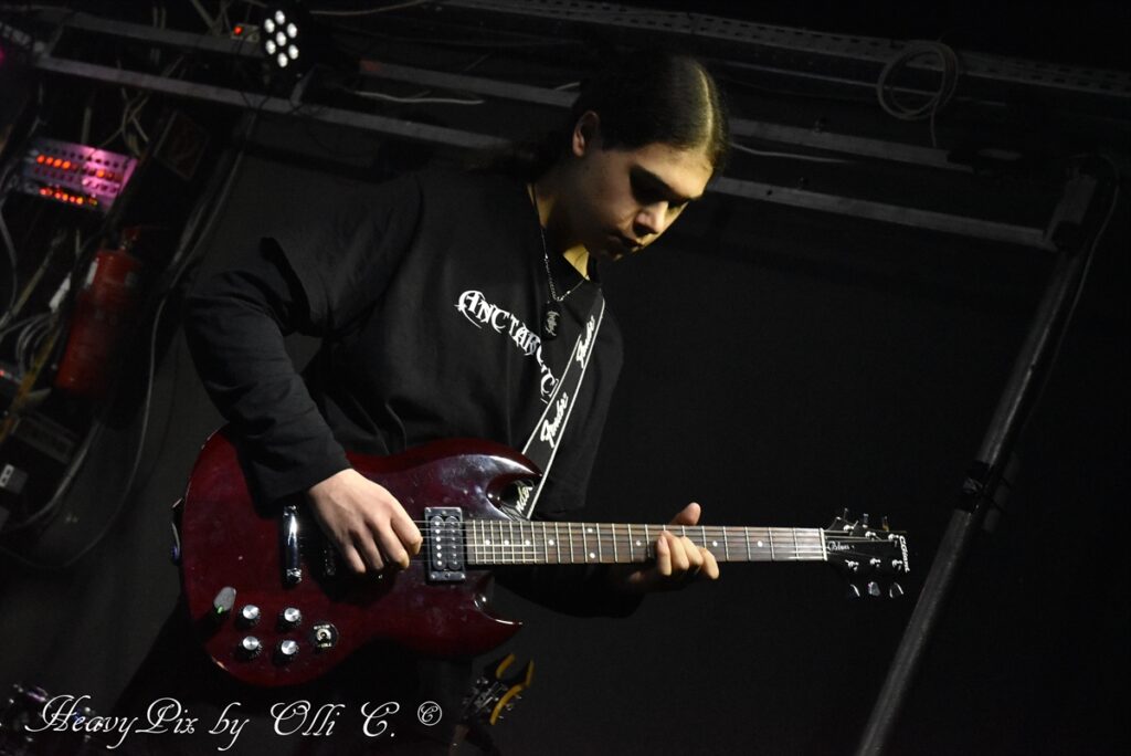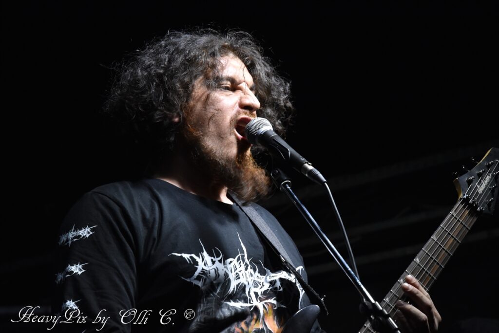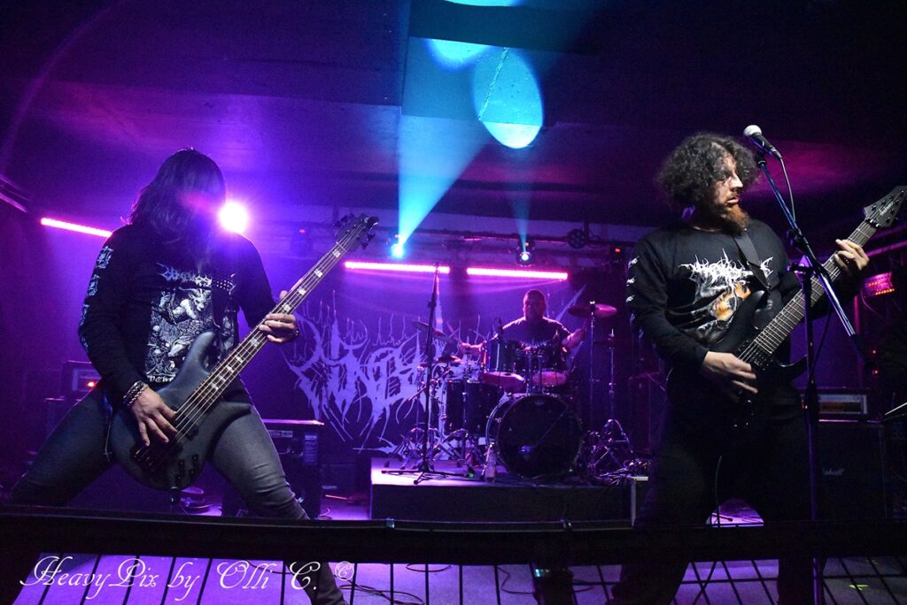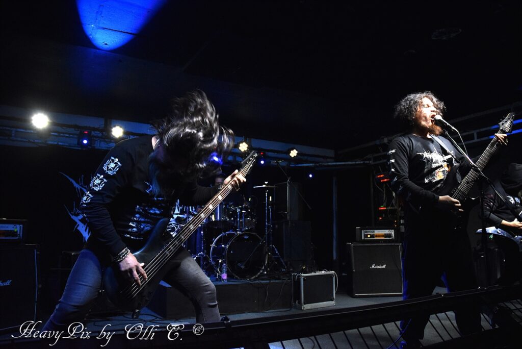 Den Höhepunkt des Abends lieferten schließlich UNBLESSED. Die Chilenen brachten eine finstere, beinahe okkulte Stimmung in den Raum und zogen das Publikum sofort in ihren Bann. Ihr Sound war roh, düster und von einer bedrohlichen Intensität geprägt, die perfekt zur engen, schwitzigen Clubatmosphäre passte. Zwischen infernalischen Growls und gnadenlosen Riffs entstand eine dichte Klangwand, die kaum Luft zum Atmen ließ. Die Band wirkte dabei wie ein eingespieltes Ritual – fokussiert, kompromisslos und mitreißend.