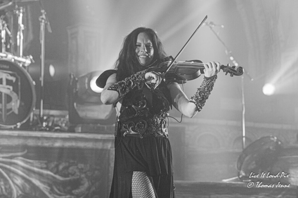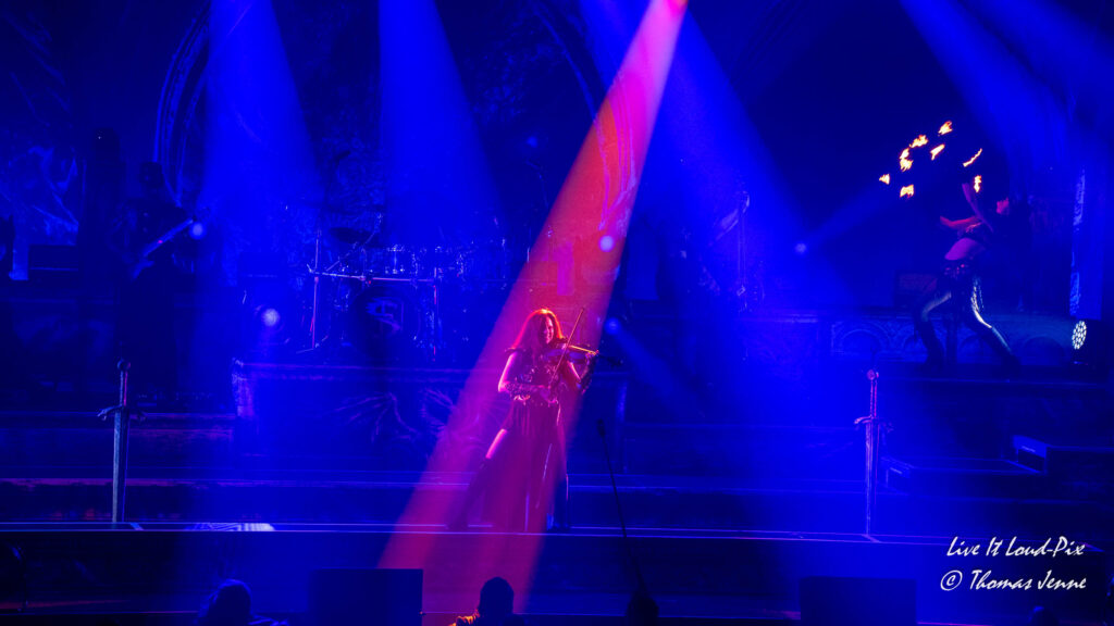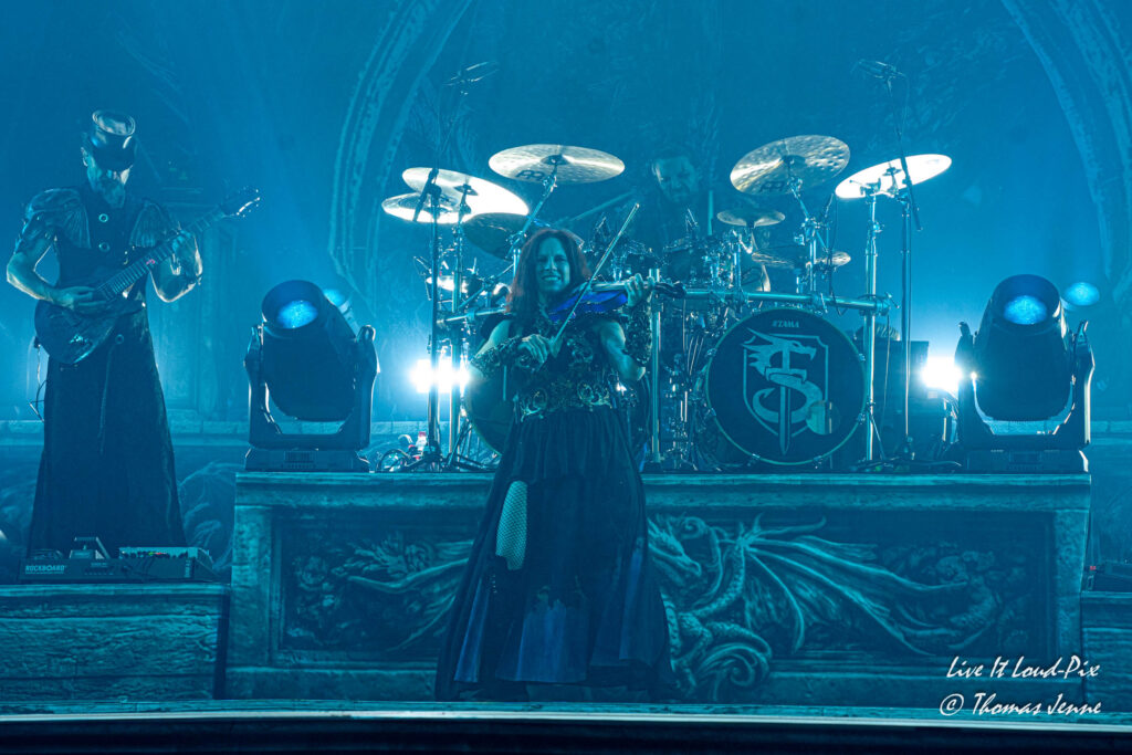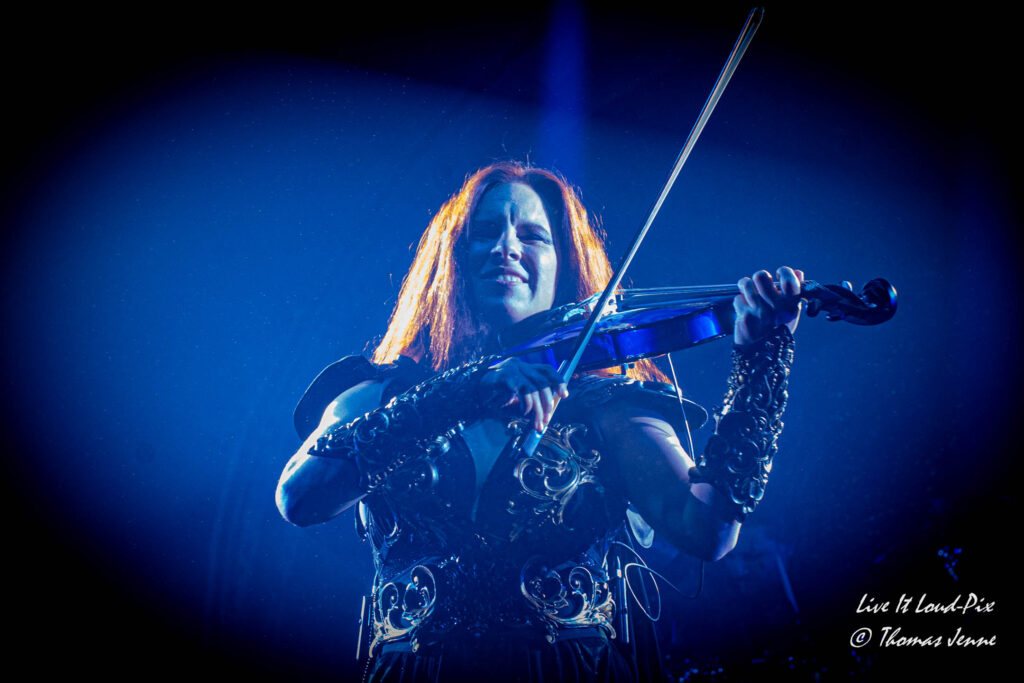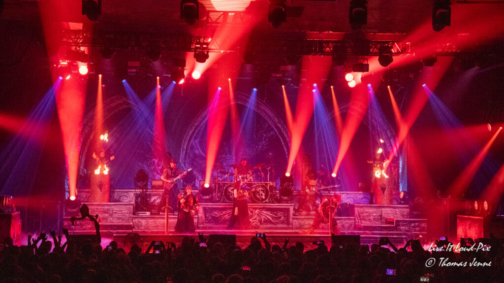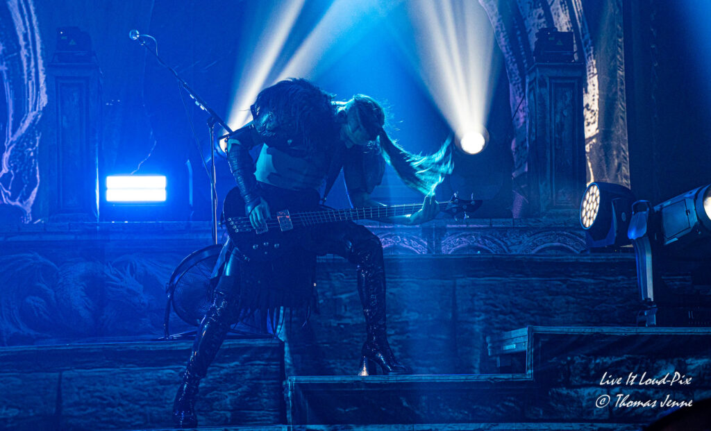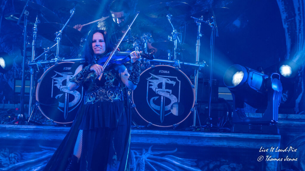 Die Songs und auch die Stimme von Frontfrau Melissa Boney sind bekanntlich deutlich im Symphonic Metal verankert, jedoch kann Frau Boney mit ihren tiefen Crowls auch von einem auf den anderen Moment auch mal ganz schnell das Beast rauslassen, wie sie bei „Jenny Of Oldstones“ eindrucksvoll beweist. Neben einigen eigenen Songs besteht die Setlist wie auch schon das Debutalbum hauptsächlich aus „vermetallten“ Neuinterpretationen von Filmmusik und Songs bekannter Künstler, wie z.B. „No Time to Die“ von Billie Eilish. Stimmungsmäßig ist das Publikum noch etwas verhalten, und so bleibt es während der Songs meist recht ruhig in der Halle, wohl auch weil viele Zuschauer die Songs bislang nicht kannten.