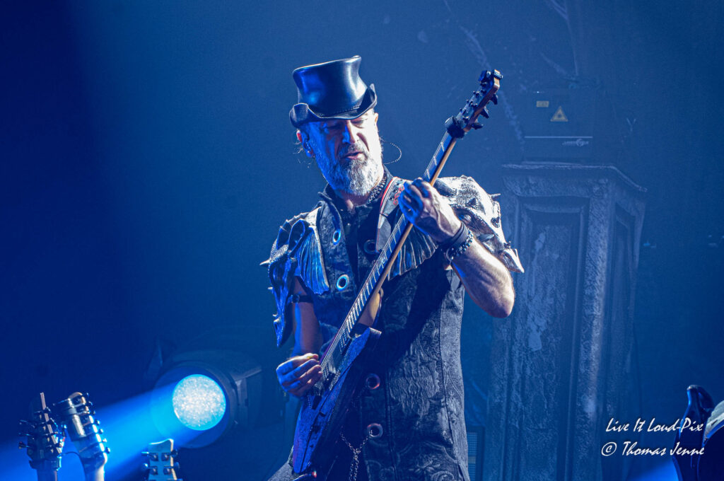Mit einer kleinen „Vorwarnung“ kündigt Chris die LOTL-Version von „Cha Cha Cha“ des finnischen Rappers Käärijä an, der damit 2023 für sein Heimatland ebenfalls am ESC teilgenommen hatte. Aus Jux hatten Chris & Co den HipHop-Song auf finnisch eingespielt und auf ihr Cover-Album „Weapons Of Mass Seduction“ gepackt. Eigentlich glaubte man, dass der Song eher „in der Versenkung verschwinden würde“, so Chris, doch die Fans wollten ihn finnisch singen hören, daher beschloss man im Vorfeld der Tour den Titel auf die Setlist zu setzen. Gesagt getan, wenn er sich auch „sprachlich nackig machen musste“ und ein Textblatt zur Unterstützung verwendet, nimmt sich Chris ein Herz und gibt ein Bestes, den Song auch Live auf Finnisch zu performen, was ihm auch sehr gut gelungen ist. Und tatsächlich entpuppt sich der finnische HipHop-Song mit seinem Mitsingrefrain zum neuen Fanliebling und so tönten laute „Cha Cha Cha“ Gesänge durch das bestens gelaunte Publikum – Partymodus incl. Wall of Death mit Bassist Klass, der sich mit seinem Bass mitten unter die Offenbacher Fans mischt.