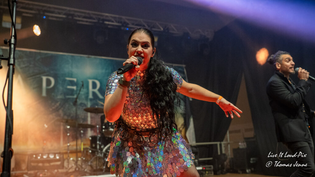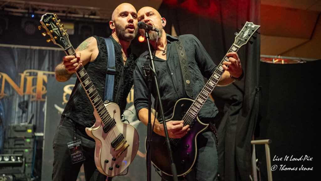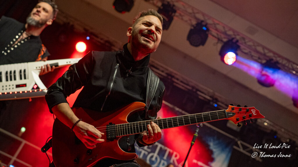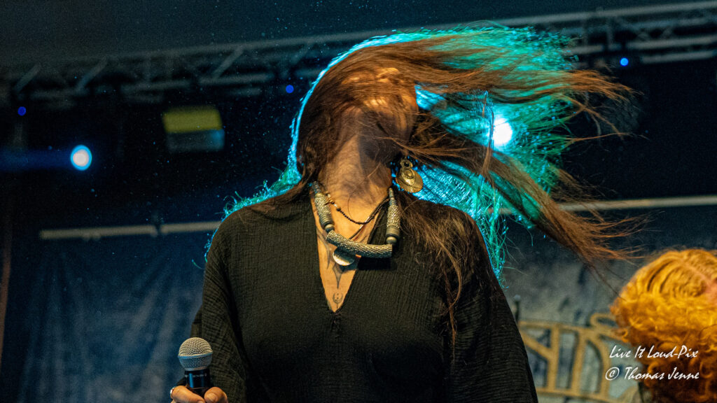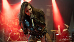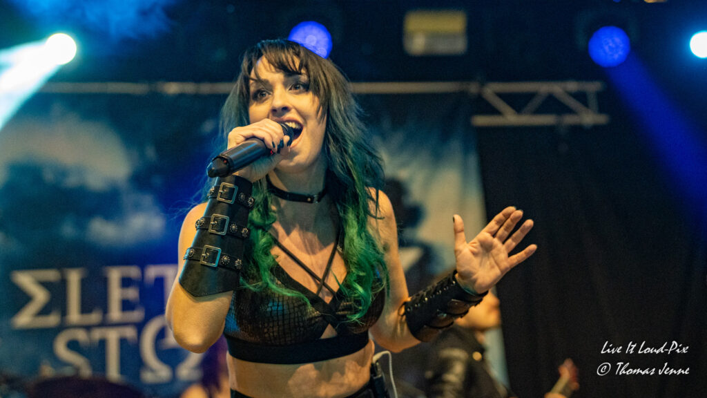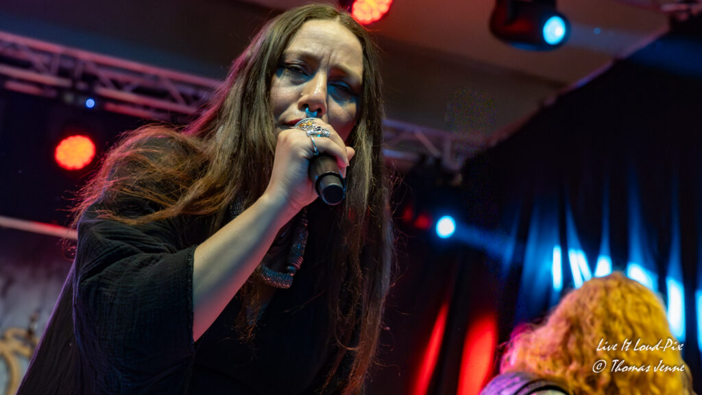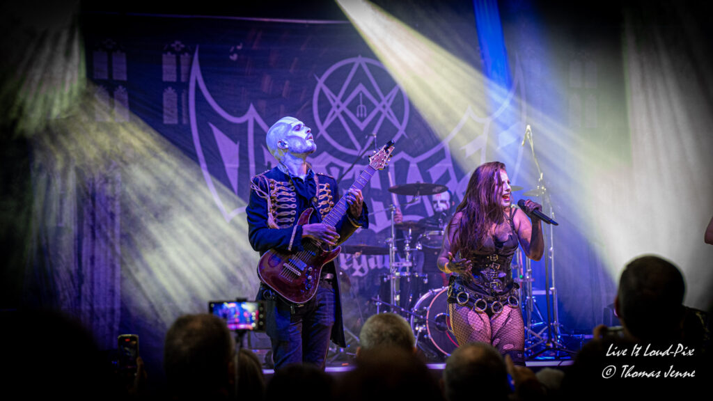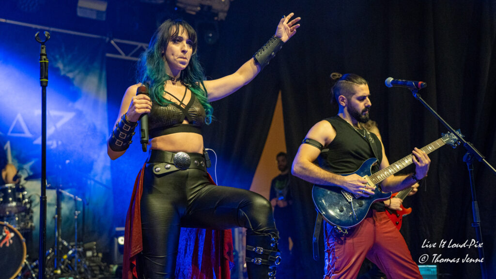 Doch wird die italienische Bandvon Ihren Fans natürlich vor allem wegen des Gesangsduo Michele Guaitoli (u.a. Vision Of Atlantis) und der US-Sängerin Kristin Starkey geliebt, die im Mittelpunkt der Band stehen Kristin, übrigens mit abgeschlossenem Studium und Doktortitel dekoriert, bringt viel Erfahrung aus ihren Auftritten in der Oper in den USA mit in die Band. Ihre opernhafte Stimme prägt an diesem Abend den melodische Symphonic-Metals und unterstreicht mit ihrem Glitzerkleid zusätzlich den glamourösen Charakter des Auftritts. Bei „I am the Fire“ zeigt sie erstmals, zu welchen Höhenlagen sie Ihre Stimme treiben kann, sodass die Gläser an der Theke des Ausschanks zu platzen drohten.