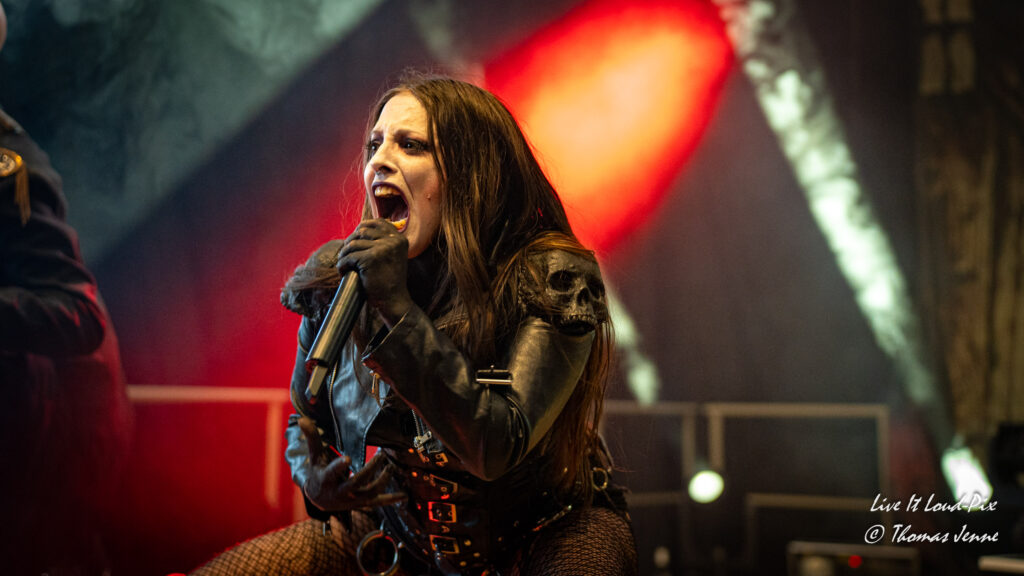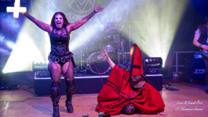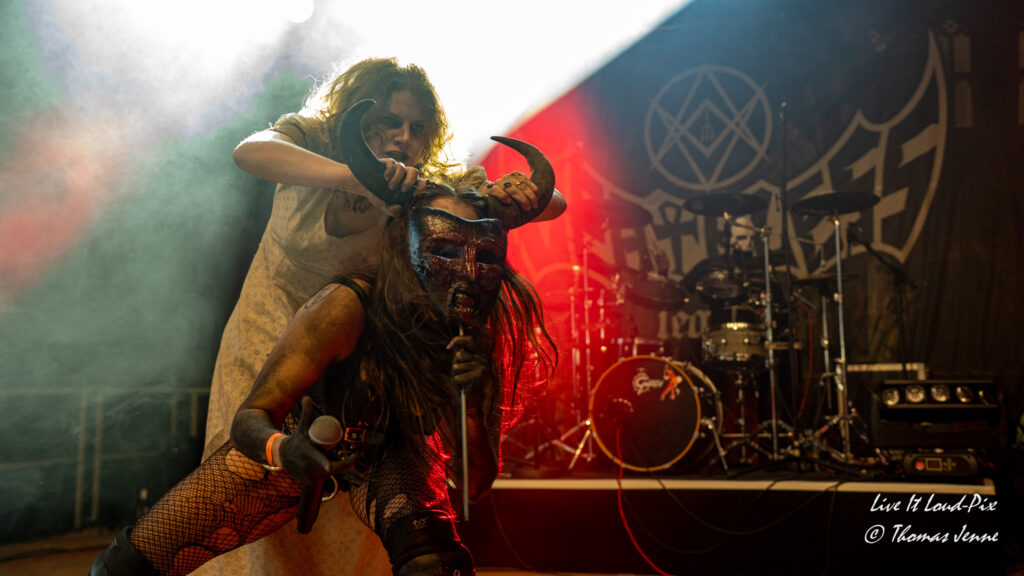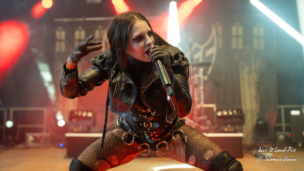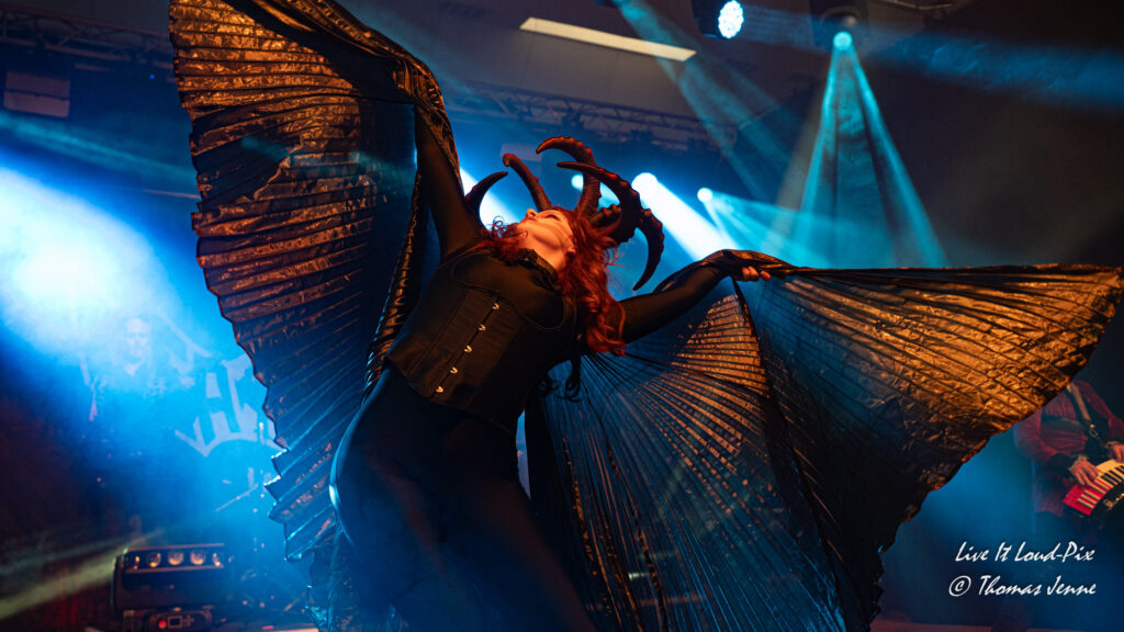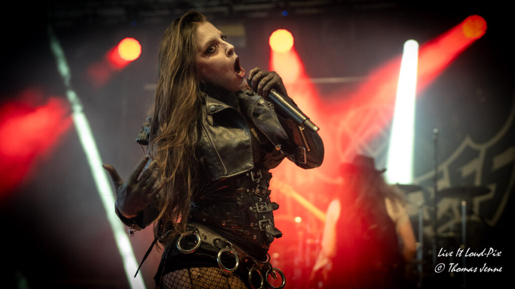 Trotz erneuter Soundprobleme zum Start mit dem Opener „Damnatio Aeterna“, bei dem die Stimme von Eleonor fast überhaupt nicht zu hören war, scherte sie sich im wahrsten Sinne des Wortes einen Teufel und legte los wie von der Tarantel gestochen. Das kleine Energiebündel war permanent in Action und war mit ihren diabolischen Gesichtsausdrücken für uns Fotografen ein mehr als dankbares Fotomotiv bei unserer Arbeit im Graben. Doch nicht nur Eleonora bot Anlass zu Dauerfeuer an der Kamera, auch ihre Mitmusiker und ganz besonders die Performance-Künstlerin der Band mit Namen „The Red Witch“ sorgte für prächtige Bilder und große Augen im beeindruckten Publikum. Nachdem dann auch endlich der Gesang im Publikum zu hören war, zeigte sich endlich auch das volle Potential der Band und besonders der Stimme von Eleonora. Mit ihren kraftvollen Vocals, die mit jeder Menge Power in den Stimmbändern ausgestattet sind, mal melancholisch sanft, dann wieder zum diabolischen Vocals hin und her wechselte, bot sie eine starke Metal-Performance mit Horror-Ästhetik. Neben den starken Songs vom aktuellen Album boten die Italiener auch einige Songs des Vorgängeralbums „Mater Lavarum“ und den Titeltrack „Ritual of Black Magic“ von Album Nr. 5. Die Band begeistert die Zuhörer trotz früher Stunde mit Ihrem dunklen und okkulten Gesamtkonzept, dass an vielen Stellen auch Dank der symphonischen Keyboardklänge etwas an ein Horror-Musical erinnerte.