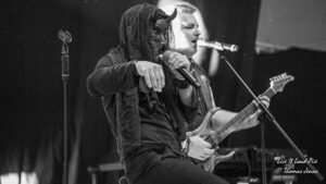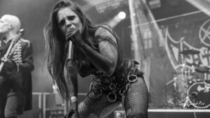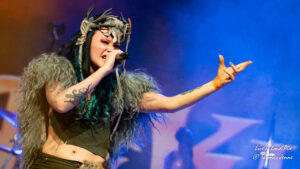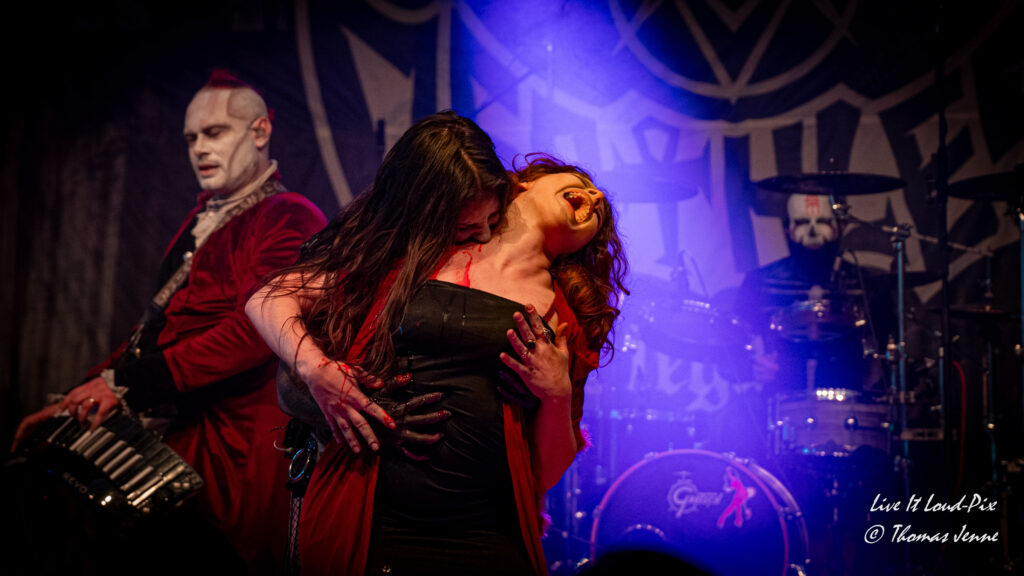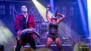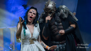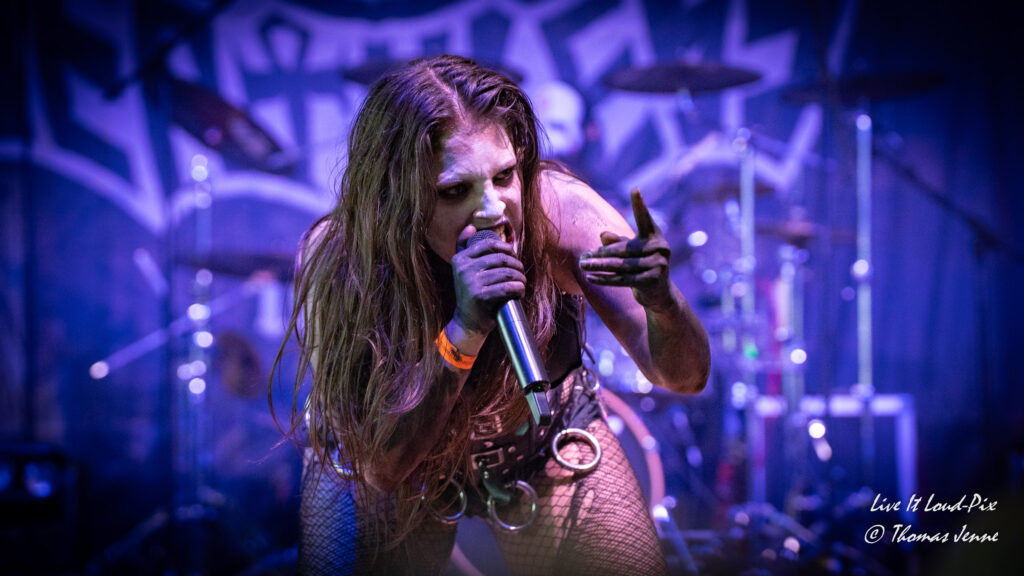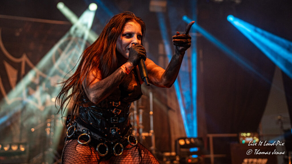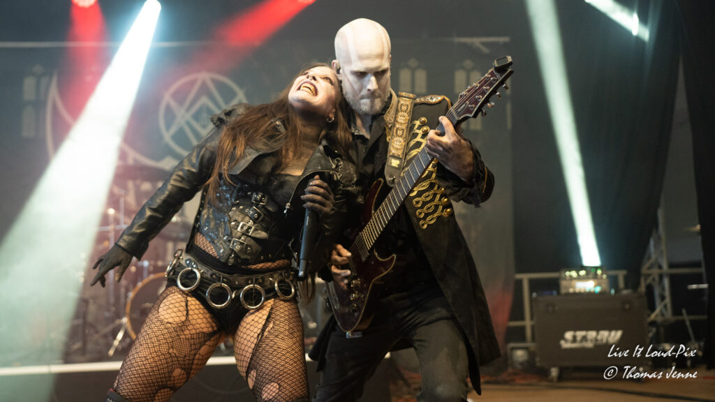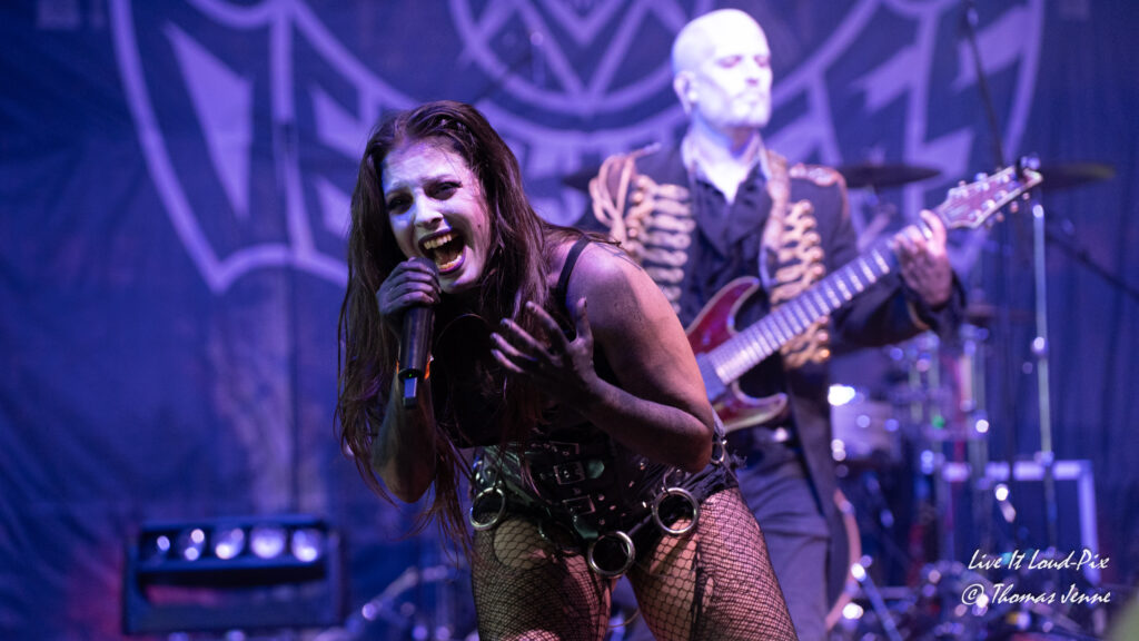 Trotz erneuter Soundprobleme zum Start mit dem Opener „Damnatio Aeterna“, bei dem die Stimme von Eleonor fast überhaupt nicht zu hören war, scherte sie sich im wahrsten Sinne des Wortes einen Teufel und legte los wie von der Tarantel gestochen. Das kleine Energiebündel war permanent in Action und war mit ihren diabolischen Gesichtsausdrücken für uns Fotografen ein mehr als dankbares Fotomotiv bei unserer Arbeit im Graben. Doch nicht nur Eleonora bot Anlass zu Dauerfeuer an der Kamera, auch ihre Mitmusiker und ganz besonders die Performance-Künstlerin der Band mit Namen „The Red Witch“ sorgte für prächtige Bilder und große Augen im beeindruckten Publikum. Nachdem dann auch endlich der Gesang im Publikum zu hören war, zeigte sich endlich auch das volle Potential der Band und besonders der Stimme von Eleonora. Mit ihren kraftvollen Vocals, die mit jeder Menge Power in den Stimmbändern ausgestattet sind, mal melancholisch sanft, dann wieder zum diabolischen Vocals hin und her wechselte, bot sie eine starke Metal-Performance mit Horror-Ästhetik. Neben den starken Songs vom aktuellen Album boten die Italiener auch einige Songs des Vorgängeralbums „Mater Lavarum“ und den Titeltrack „Ritual of Black Magic“ von Album Nr. 5. Die Band begeistert die Zuhörer trotz früher Stunde mit Ihrem dunklen und okkulten Gesamtkonzept, dass an vielen Stellen auch Dank der symphonischen Keyboardklänge etwas an ein Horror-Musical erinnerte.
