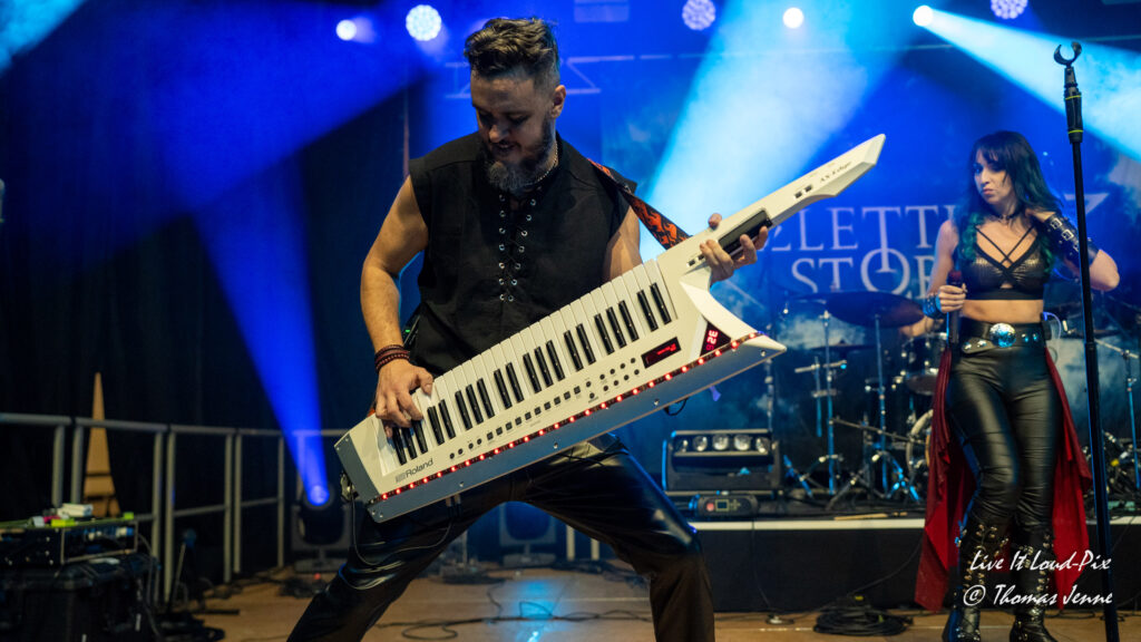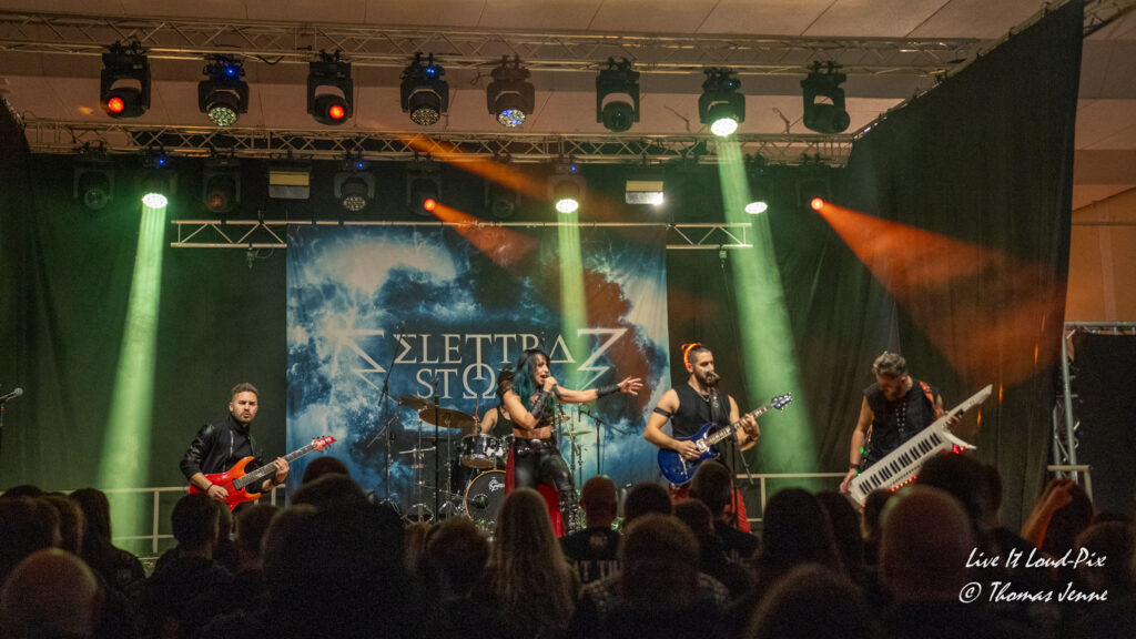 Mit Elettra Storm aus Italien folgte dann die erste Female Fronted Band des Festivals. Die Band um Sängerin Crystal Laura Emiliani verschreibt sich dem symphonischen Powermetal italienischer Prägung im Stile von Bands wieRhapsodie of Fire oder Frozen Crown, gepaart mit dem schnellen Gitarrenspiel vonDragonforce. Die Riffs der beiden Saitenhexer Francis D. Mary und Matteo Antonidürften wohl die schnellsten des gesamten Festivals gewesen sein, konnten aber nicht nur durch die Geschwindigkeit überzeugen. Leider ging mir das ständige Doublebass-Geprügel nach einigen Songs etwas auf den Nerv. Fans von weiblichem Gesang dürften auf die Kosten gekommen sein. Auch wenn nicht alle Songs zündeten, konnten Elettra Storm mit ihren melodischen Titeln insgesamt doch überzeugen.