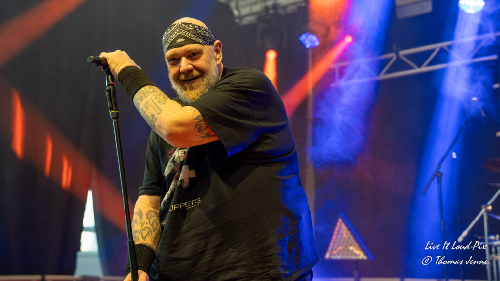 Leider gehören Manntra zu den Bands, die es den Zuschauern und uns Fotografen nicht gerade leicht machen, das Geschehen auf der Bühne klar und deutlich zu sehen oder auf Bildern einzufangen. Viele Rotlicht und eher dunkel gehaltene Bühnenausleuchtung, dazu ein Sänger, der permanent in Bewegung ist und „nicht still stehen kann“. Kein Vorwurf an Marko, vielleicht liegt es aber auch einfach nur an nachlassender Konzentration nach den vielen Bildern, die ich während der beiden Tage schon geschossen habe.