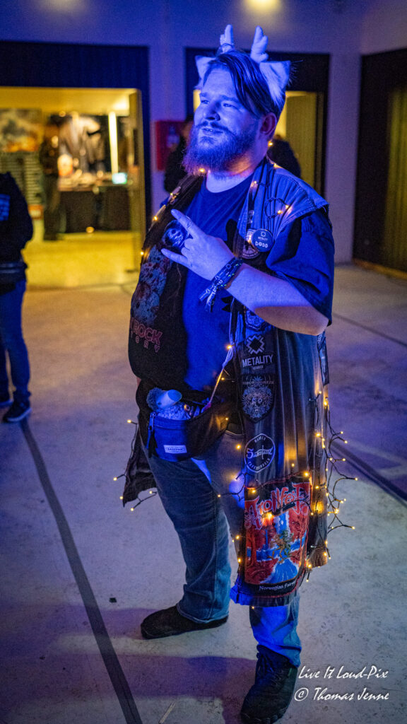 Auch wenn die Weihnachtsfeiertage bereits vorbei waren, zeigte sich doch, dass Metaller auch eine weiche Seite haben. Die Weihnachtsdeko hatte ja noch lange nicht ausgedient und so wurde die Lichterkette kurzerhand als Kuttenbeleuchtung umfunktioniert.