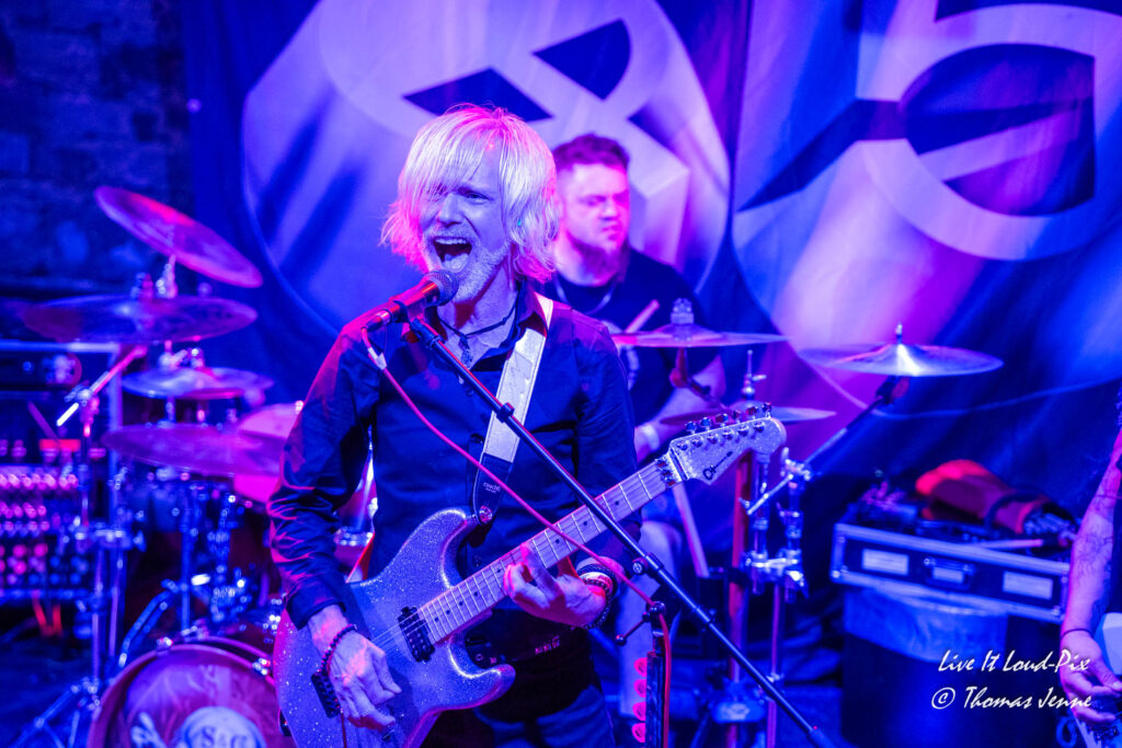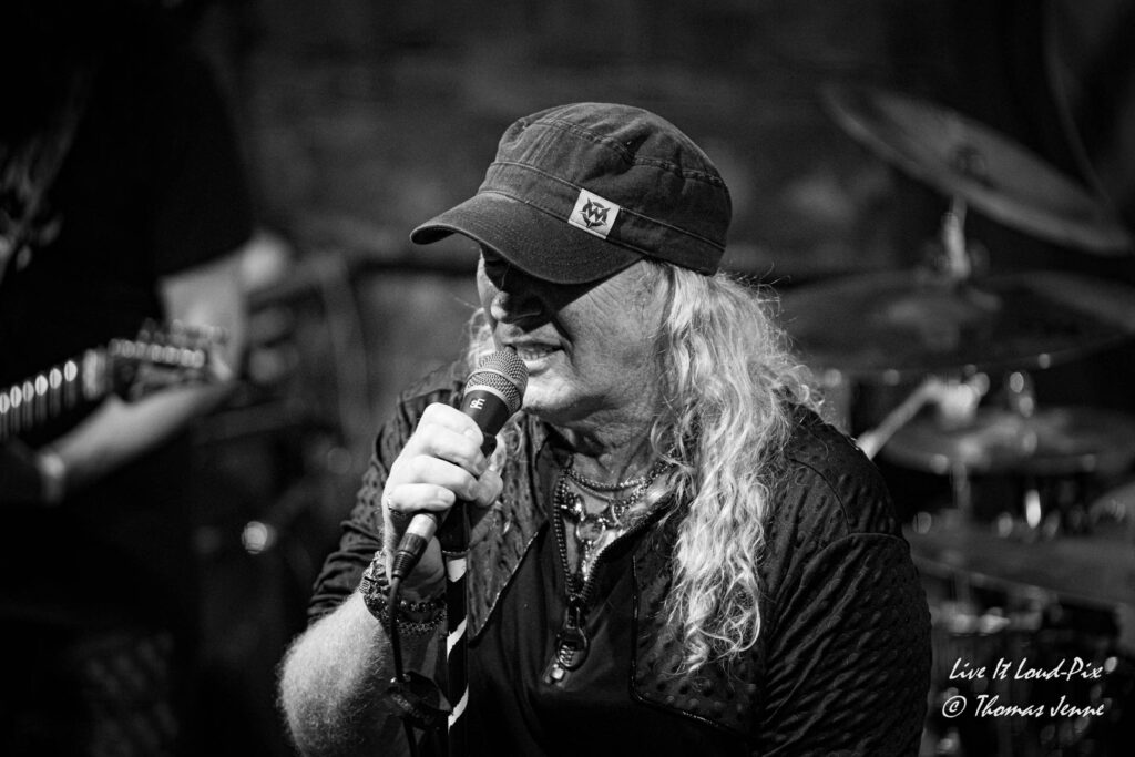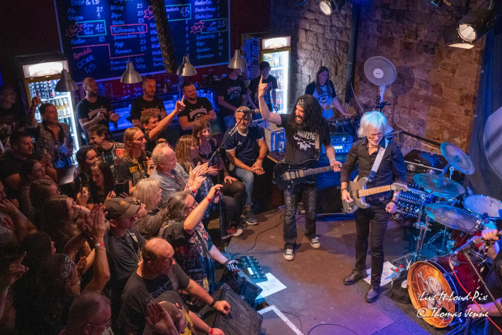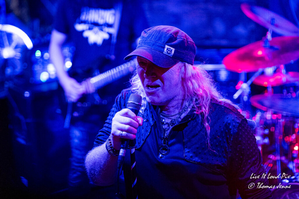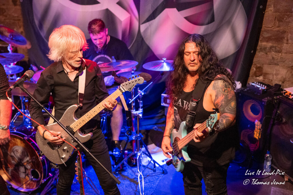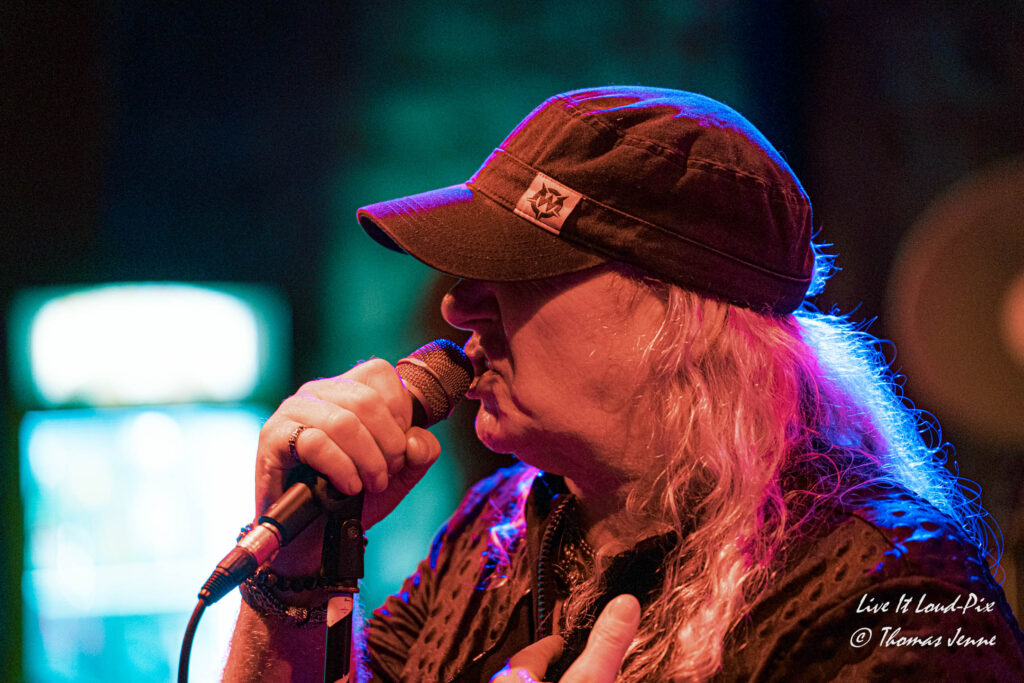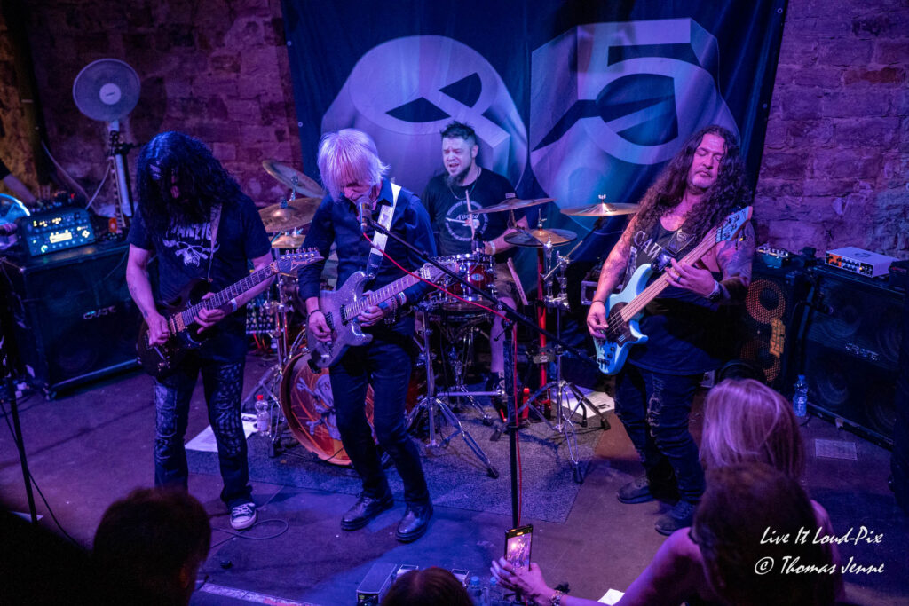 Zum Ende des Gigs kommt dann natürlich auch der von allen Fans sehnsüchtig erwartete Q5-Übersong schlechthin: „Steel the Light“, der in meiner Jugend bei keiner Metaldisco fehlen durfte, sorgte als Höhepunkt des Abends für etwas Ekstase im Publikum. Jonathan konnte sich natürlich vom ersten Ton an auf lautstarke Unterstützung verlassen, denn der Track ist quasi das „The Number of The Beast“ von Q5 und gehört definitiv zu den Klassikern des US-Metal der 80er…was ein geiler Song, der frenetisch von den Fans abgefeiert wurde. Auch wenn die Stimme von Jonathan hier leider etwas dünn rüberkam, wurde dieses Manko durch das Publikum locker wettgemacht. Mit „Rock`n`Roll“ gab`s noch ein Cover von Led Zeppelin als Zugabe. Nicht schlecht performt, doch hätte ich mir stattdessen lieber noch den ein oder anderen eigenen Song vom Zweitling gewünscht.