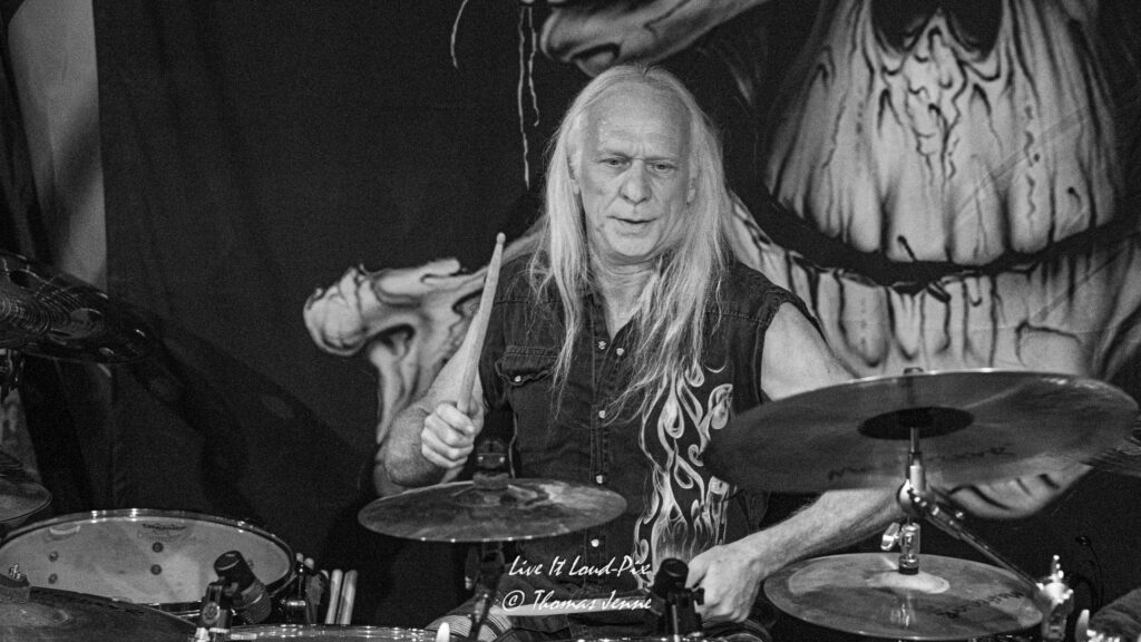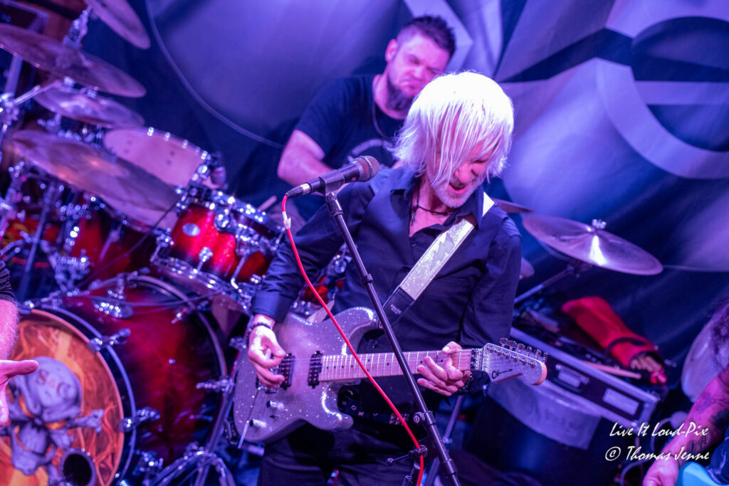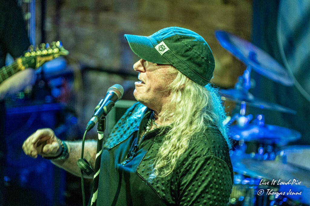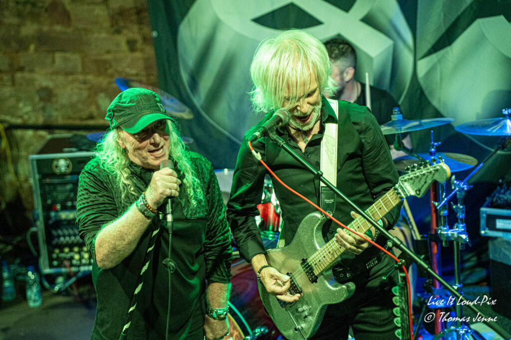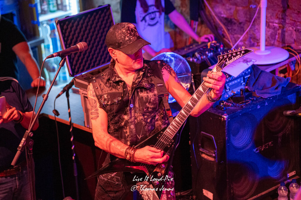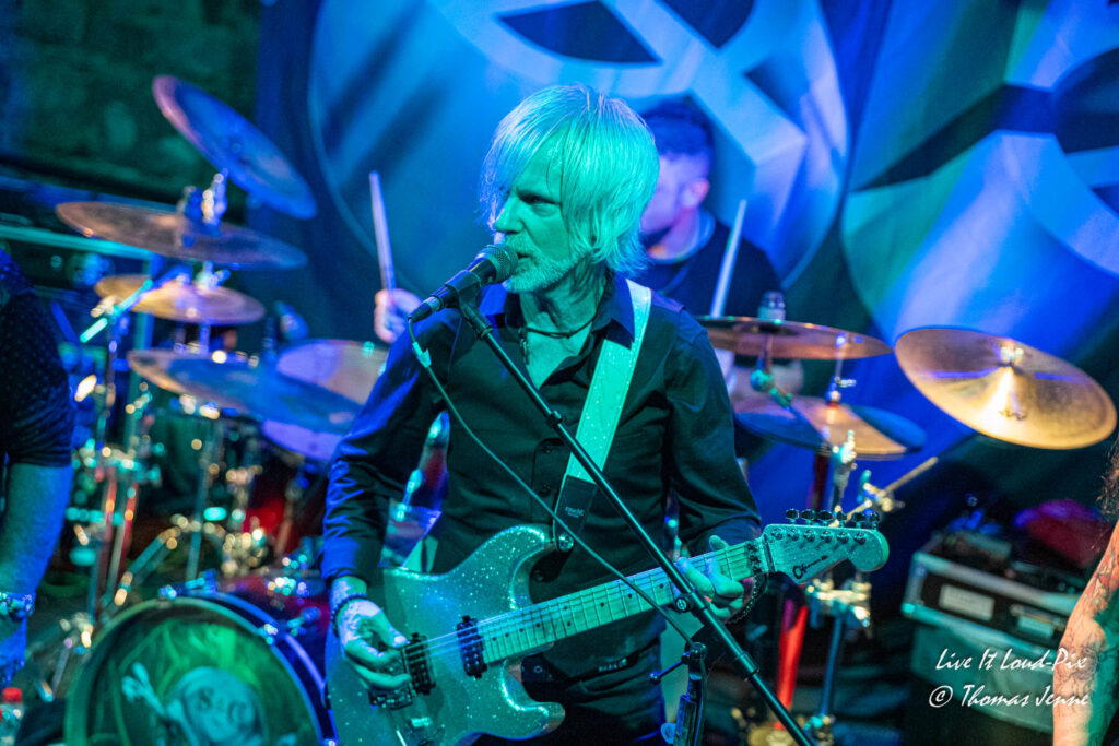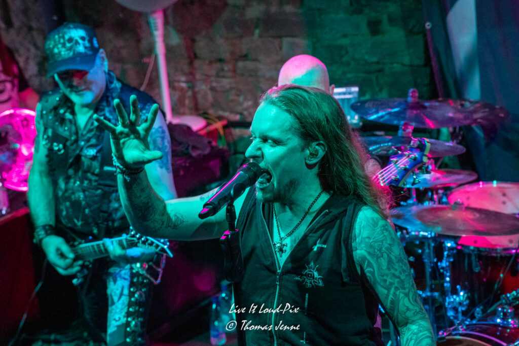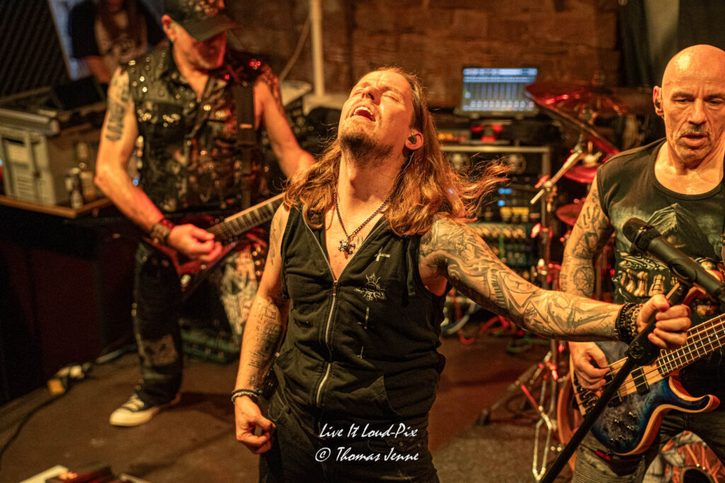 Zum Ende des Gigs kommt dann natürlich auch der von allen Fans sehnsüchtig erwartete Q5-Übersong schlechthin: „Steel the Light“, der in meiner Jugend bei keiner Metaldisco fehlen durfte, sorgte als Höhepunkt des Abends für etwas Ekstase im Publikum. Jonathan konnte sich natürlich vom ersten Ton an auf lautstarke Unterstützung verlassen, denn der Track ist quasi das „The Number of The Beast“ von Q5 und gehört definitiv zu den Klassikern des US-Metal der 80er…was ein geiler Song, der frenetisch von den Fans abgefeiert wurde. Auch wenn die Stimme von Jonathan hier leider etwas dünn rüberkam, wurde dieses Manko durch das Publikum locker wettgemacht. Mit „Rock`n`Roll“ gab`s noch ein Cover von Led Zeppelin als Zugabe. Nicht schlecht performt, doch hätte ich mir stattdessen lieber noch den ein oder anderen eigenen Song vom Zweitling gewünscht.