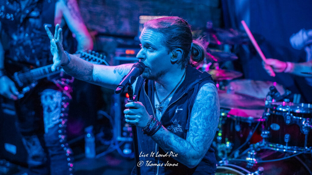 Bei schnellen „Surrender“ können sich die beiden Gitarristen Duffy Delgado und Michael David mit schnellen Riffgewitter auszeichnen. Etwas überraschend gibt es auch neue Musik von Q5 zu hören, wenn auch nur als Instrumental „Moonlight“, bei dem sich Jonathan eine kleine Pause am Mikro gönnt. Hier dürfen die Saitenhexer nochmals zum Duell antreten. Mit „Come and Gone“ gab`s auch die obligatorische Ballade vom Debut-Album, die eindrucksvoll die sanftere Seite von Q5 zeigt. Starker Song mit viel Gefühl und geiler Melodieführung, bei dem etwas Herz-Schmerz verarbeitet wurde. Einer der Highlight des Abends.